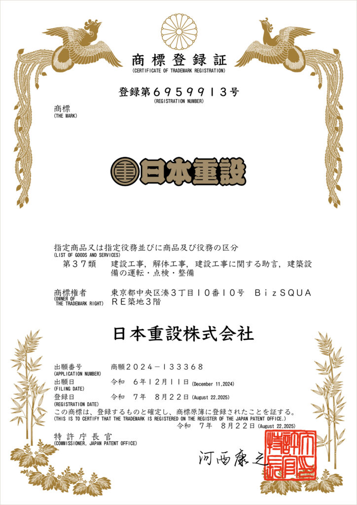 第37類 建設工事、解体工事、建設工事に関する助言、建築設備の運転・点検・整備を行う「日本重設」のロゴマークの商標登録を取得しました。