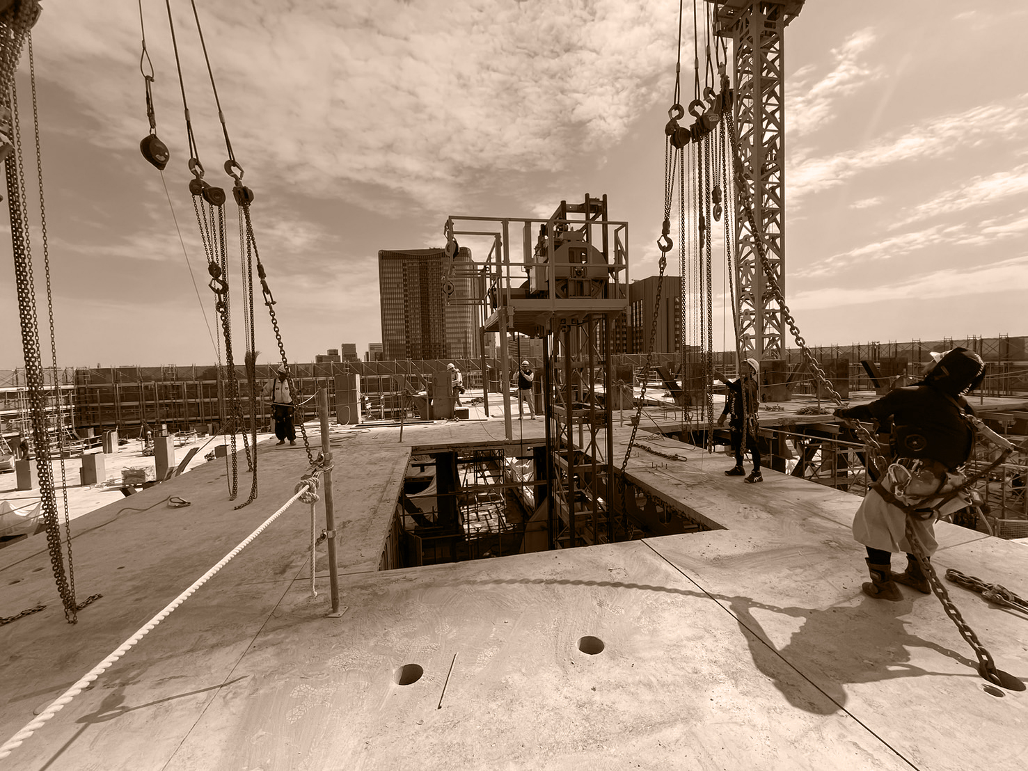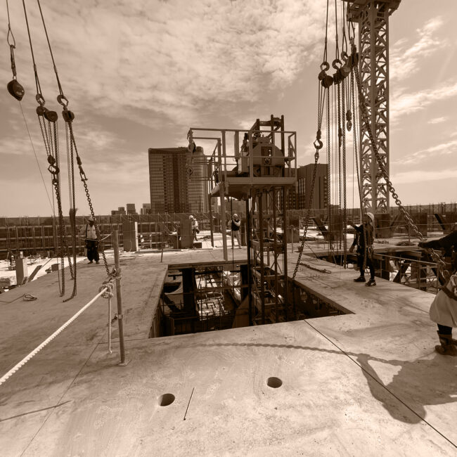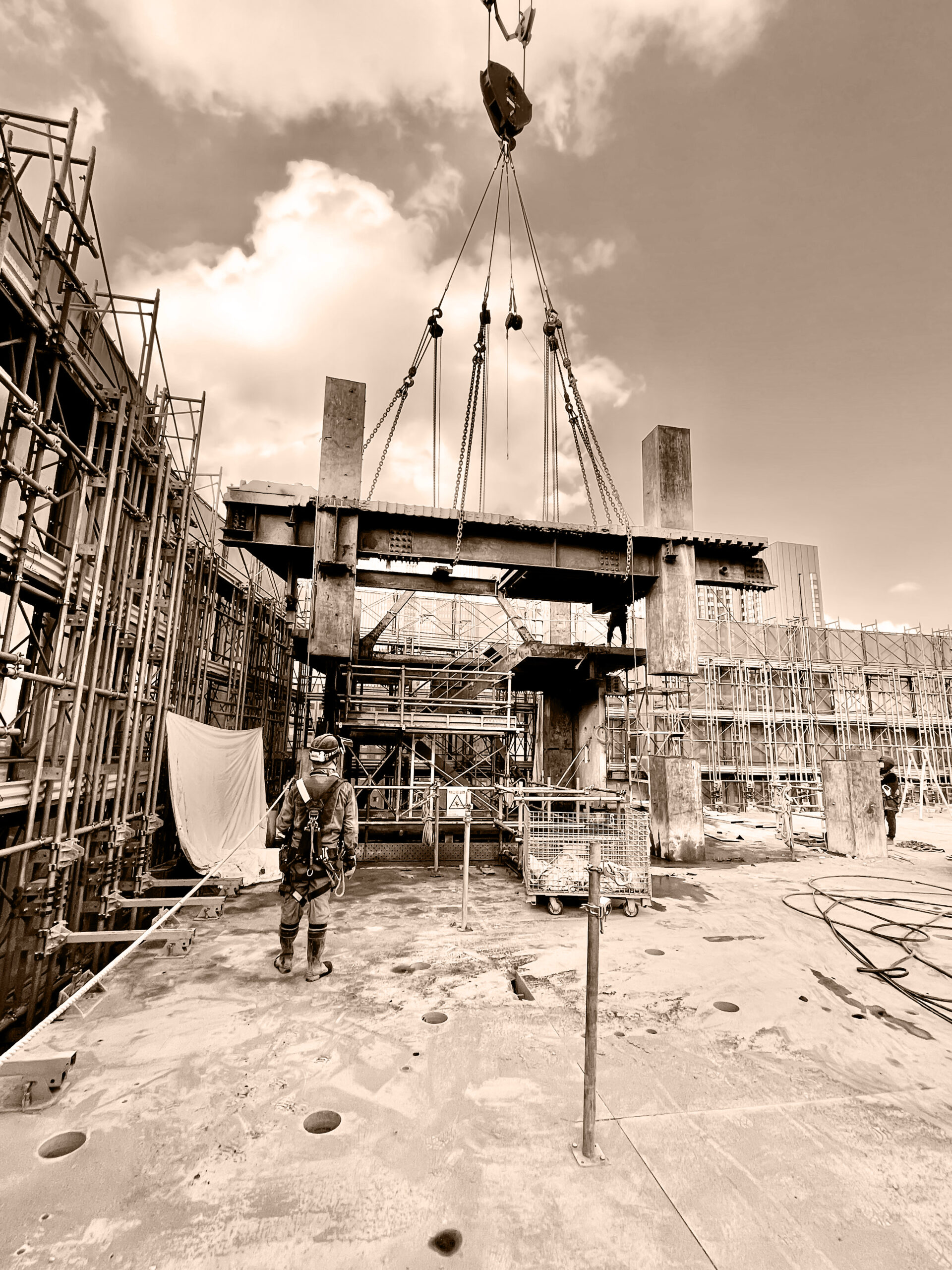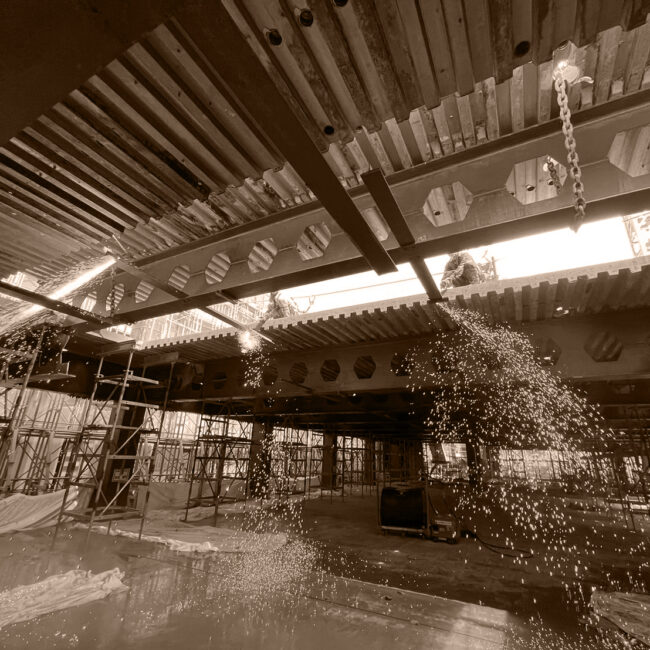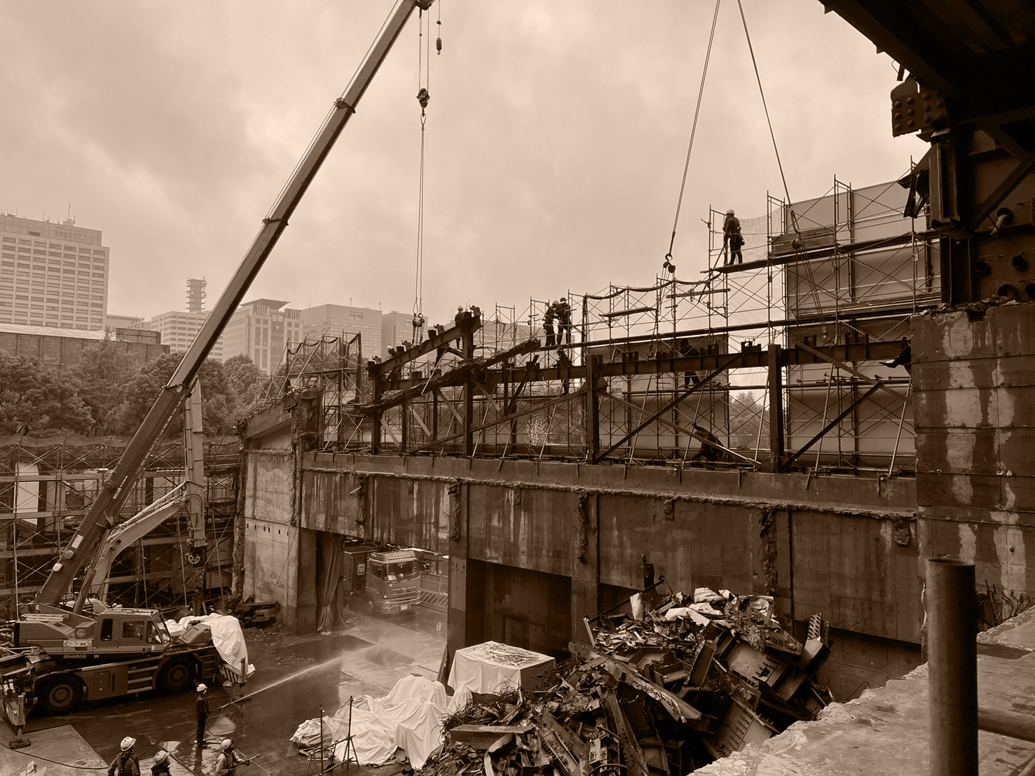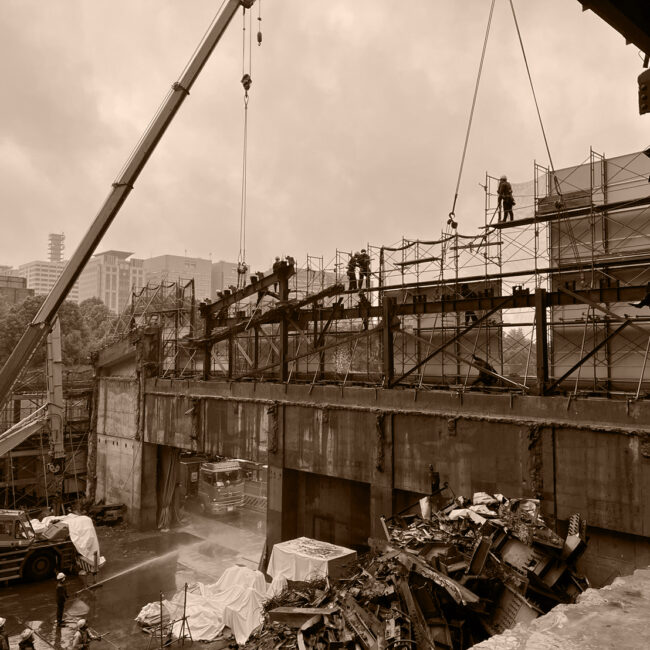 千代田区高層ビル吊り取り解体 2022年9月〜2024年9月 地上35階建、延べ床面積13484平米、解体日数2年 概要 タワークレーン使用でS造を道路カッターとガス切断し吊り取り140m下で小割 次へ千代田区解体工事 → 千代田区<br/>解体工事